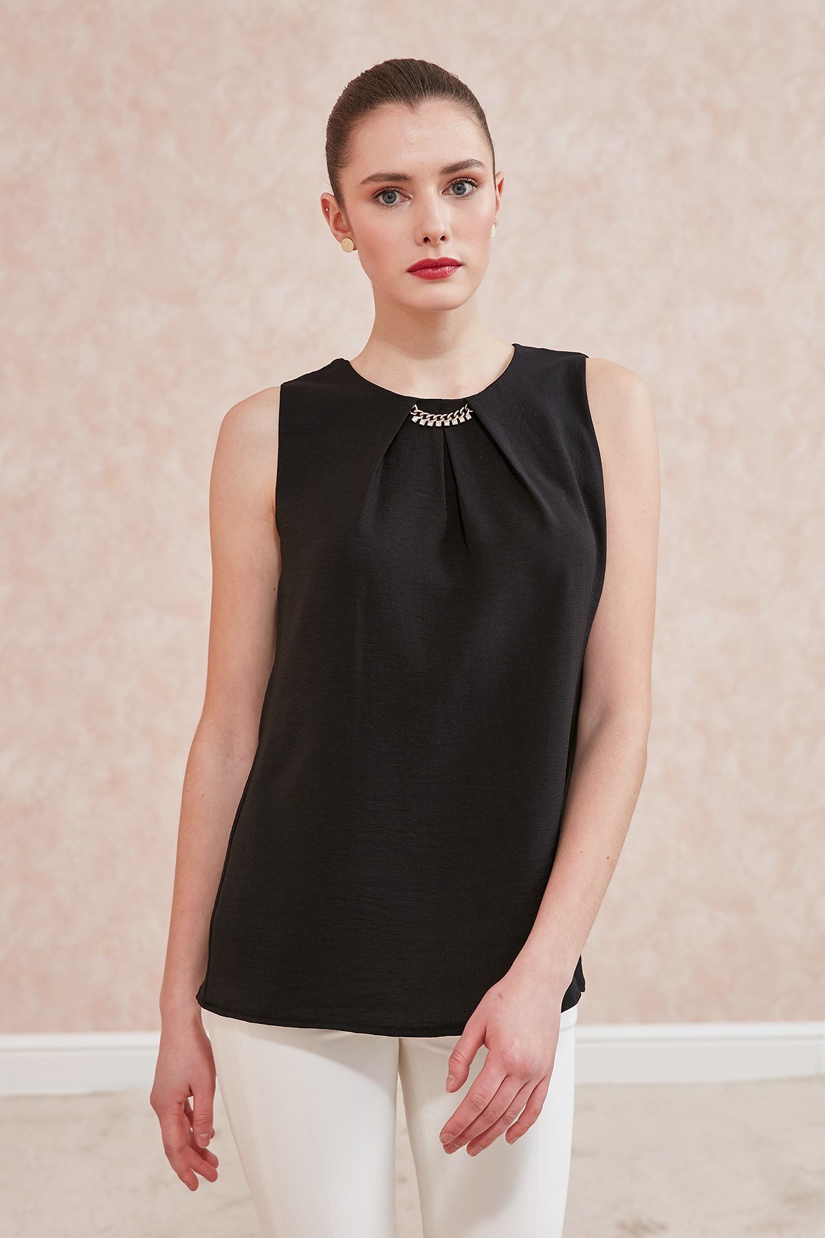 Bluz-Sıfır Yaka, Ön Pile İçi Gold Aksesuar Detaylı, Kolsuz